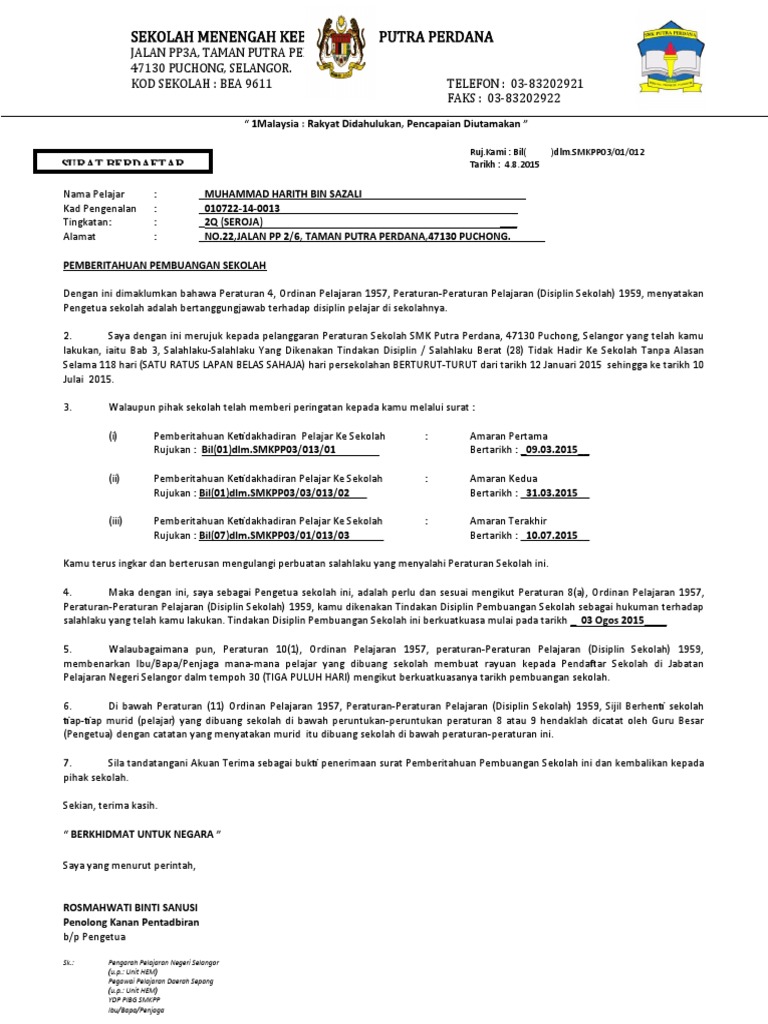 Contoh surat buang sekolah ponteng sekolah rendah aja kisz dolly. Penghantaran Surat-surat Amaran Pelajar. Tindakan Tatatertib Dengan Tujuan Buang Sekolah Tingkatan.